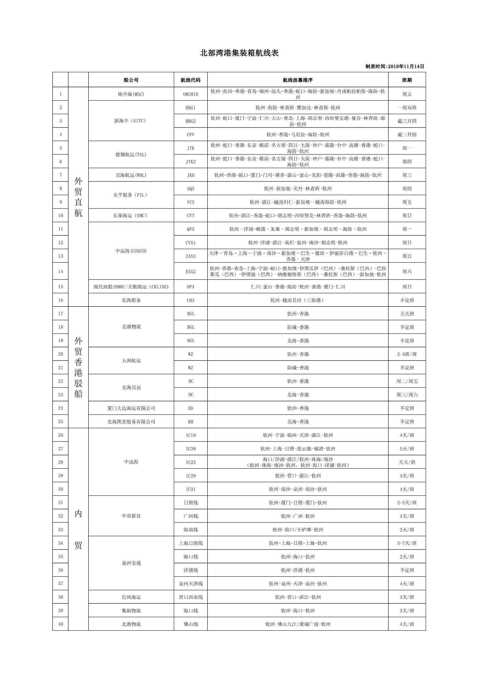 截至2019年10月底,共开通集装箱航线46条,其中内贸航线20 条,覆盖全国沿海及长江主要港口;外贸航线26条,通过香港和新加坡链接中转世界主要港口。